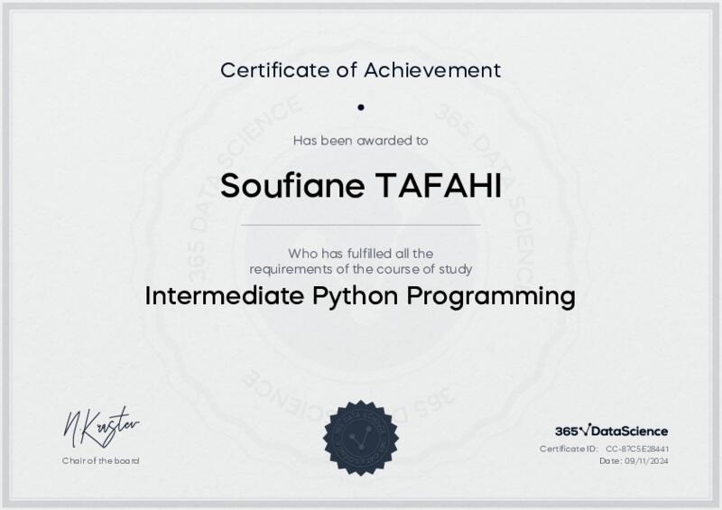 This user has been awarded the Intermediate Python Programming Certificate for successfully completing the course exam. Holding this certificate demonstrates their proficiency on the topic and signifies they are qualified to apply their newly acquired expertise in the fields of data analytics and data science.