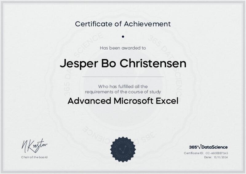 This user has been awarded the Advanced Microsoft Excel Certificate for successfully completing the course exam. Holding this certificate demonstrates their proficiency on the topic and signifies they are qualified to apply their newly acquired expertise in the fields of data analytics and data science.