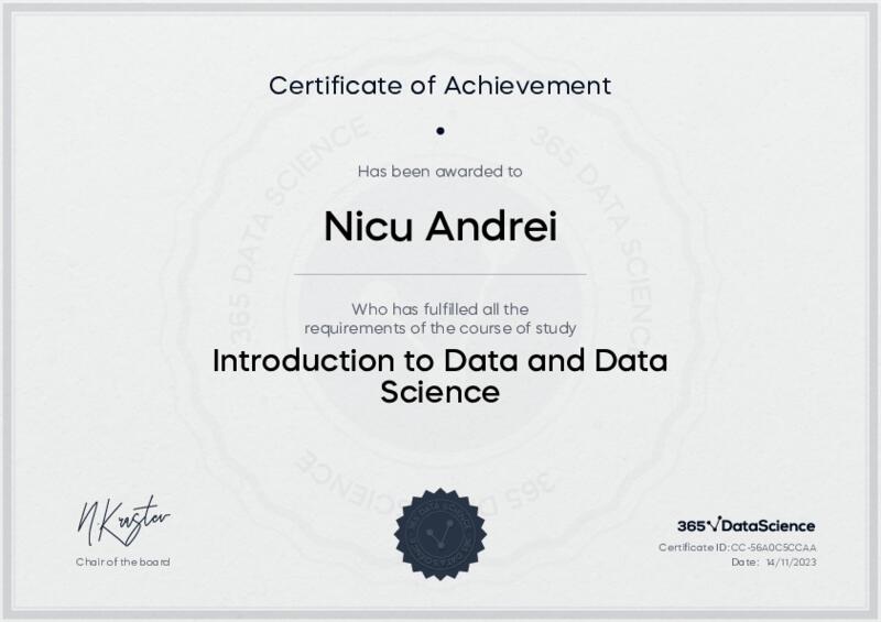 This user has been awarded the Introduction to Data and Data Science Certificate for successfully completing the course exam. Holding this certificate demonstrates their proficiency on the topic and signifies they are qualified to apply their newly acquired expertise in the fields of data analytics and data science.