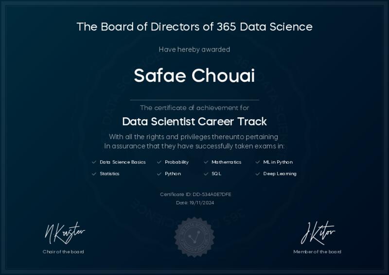 This user has been awarded the Data Scientist Career Track Certificate for successfully completing all courses and assessments. This certificate confirms their technical expertise and professional credibility to work as a data scientist.
