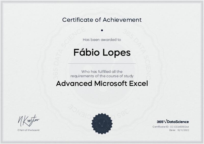 This user has been awarded the Advanced Microsoft Excel Certificate for successfully completing the course exam. Holding this certificate demonstrates their proficiency on the topic and signifies they are qualified to apply their newly acquired expertise in the fields of data analytics and data science.