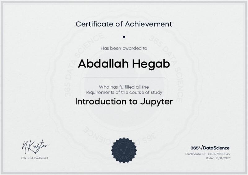 This user has been awarded the Introduction to Jupyter Certificate for successfully completing the course exam. Holding this certificate demonstrates their proficiency on the topic and signifies they are qualified to apply their newly acquired expertise in the fields of data analytics and data science.