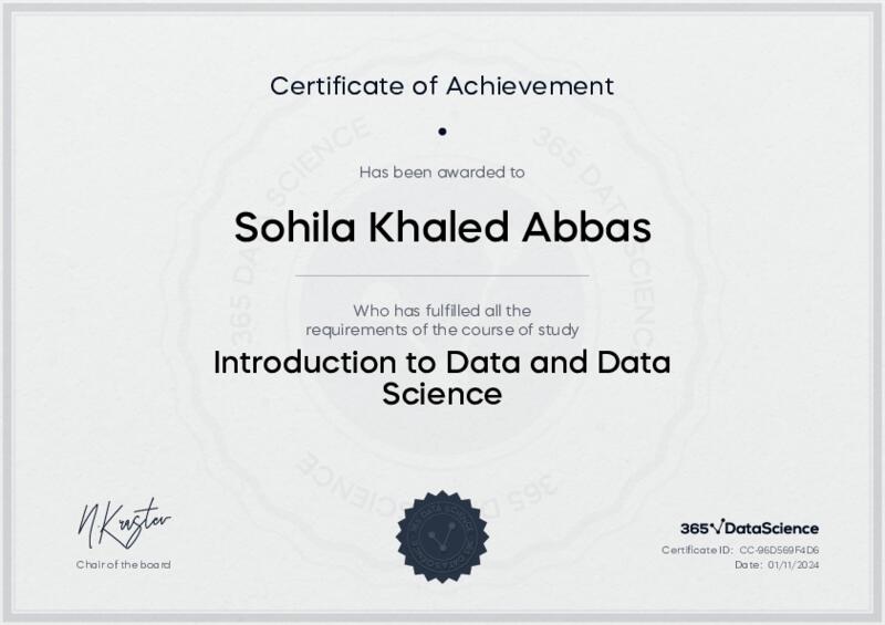 This user has been awarded the Introduction to Data and Data Science Certificate for successfully completing the course exam. Holding this certificate demonstrates their proficiency on the topic and signifies they are qualified to apply their newly acquired expertise in the fields of data analytics and data science.