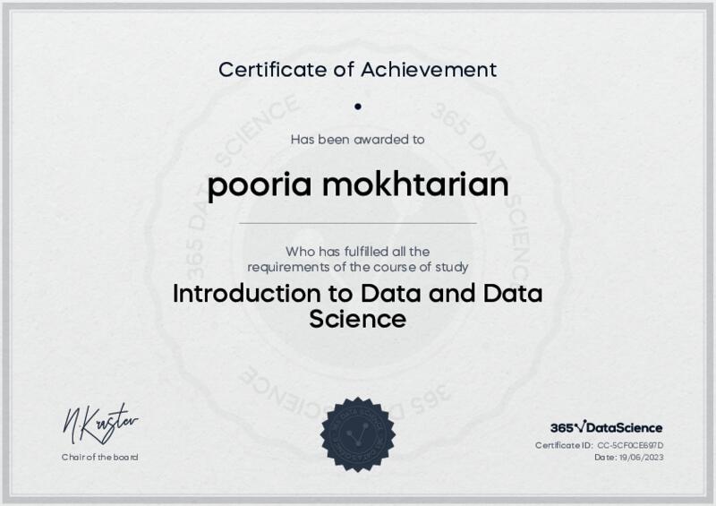 This user has been awarded the Introduction to Data and Data Science Certificate for successfully completing the course exam. Holding this certificate demonstrates their proficiency on the topic and signifies they are qualified to apply their newly acquired expertise in the fields of data analytics and data science.