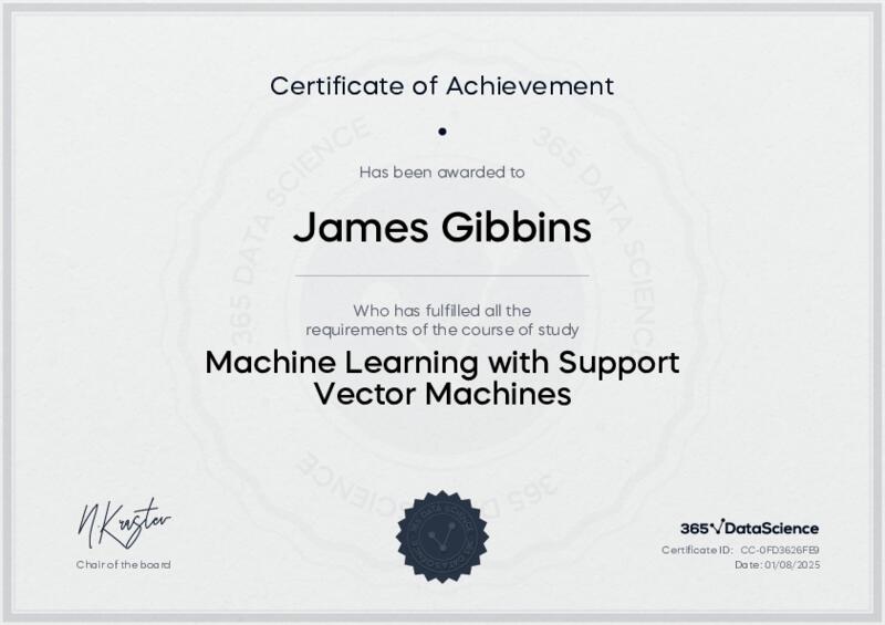 This user has been awarded the Machine Learning with Support Vector Machines Certificate for successfully completing the course exam. Holding this certificate demonstrates their proficiency on the topic and signifies they are qualified to apply their newly acquired expertise in the fields of data analytics and data science.