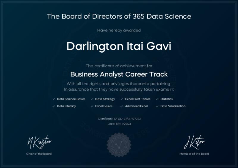 This user has been awarded the Business Analyst Career Track Certificate for successfully completing all courses and assessments. This certificate confirms their technical expertise and professional credibility to work as a business analyst.