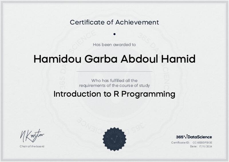 This user has been awarded the Introduction to R Programming Certificate for successfully completing the course exam. Holding this certificate demonstrates their proficiency on the topic and signifies they are qualified to apply their newly acquired expertise in the fields of data analytics and data science.