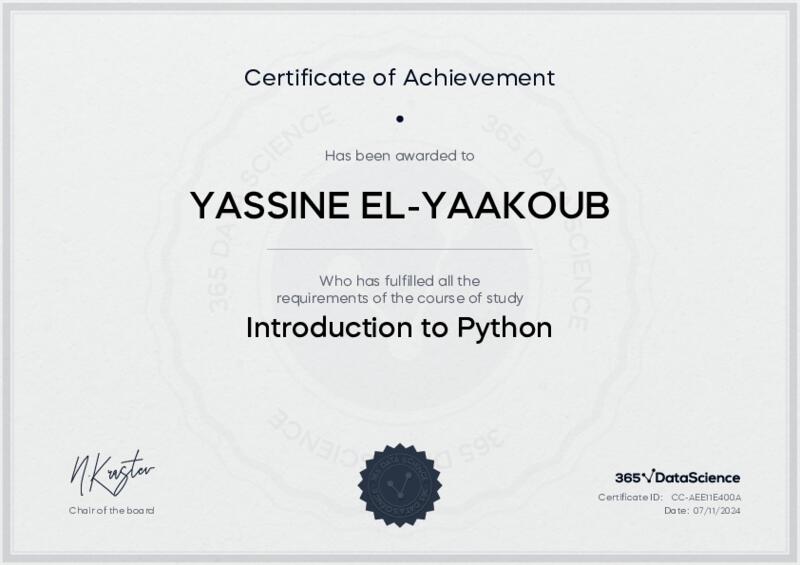 This user has been awarded the Introduction to Python Certificate for successfully completing the course exam. Holding this certificate demonstrates their proficiency on the topic and signifies they are qualified to apply their newly acquired expertise in the fields of data analytics and data science.