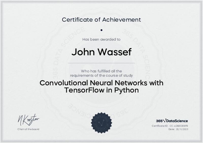 This user has been awarded the Convolutional Neural Networks with TensorFlow in Python Certificate for successfully completing the course exam. Holding this certificate demonstrates their proficiency on the topic and signifies they are qualified to apply their newly acquired expertise in the fields of data analytics and data science.