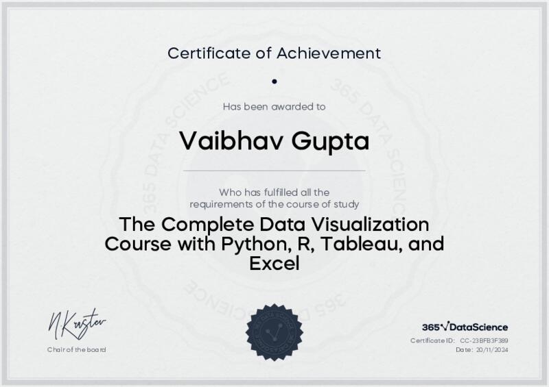 This user has been awarded the The Complete Data Visualization Course with Python, R, Tableau, and Excel Certificate for successfully completing the course exam. Holding this certificate demonstrates their proficiency on the topic and signifies they are qualified to apply their newly acquired expertise in the fields of data analytics and data science.