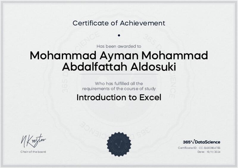 This user has been awarded the Introduction to Excel Certificate for successfully completing the course exam. Holding this certificate demonstrates their proficiency on the topic and signifies they are qualified to apply their newly acquired expertise in the fields of data analytics and data science.