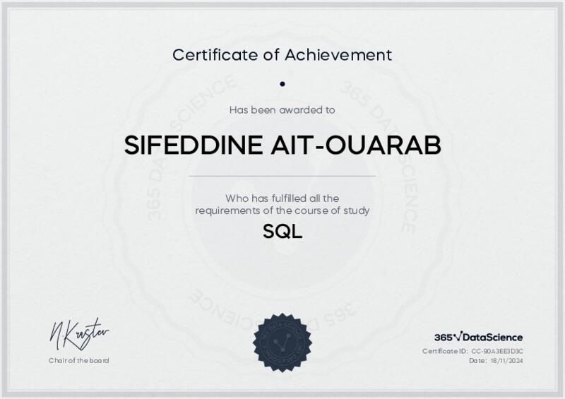 This user has been awarded the SQL Certificate for successfully completing the course exam. Holding this certificate demonstrates their proficiency on the topic and signifies they are qualified to apply their newly acquired expertise in the fields of data analytics and data science.
