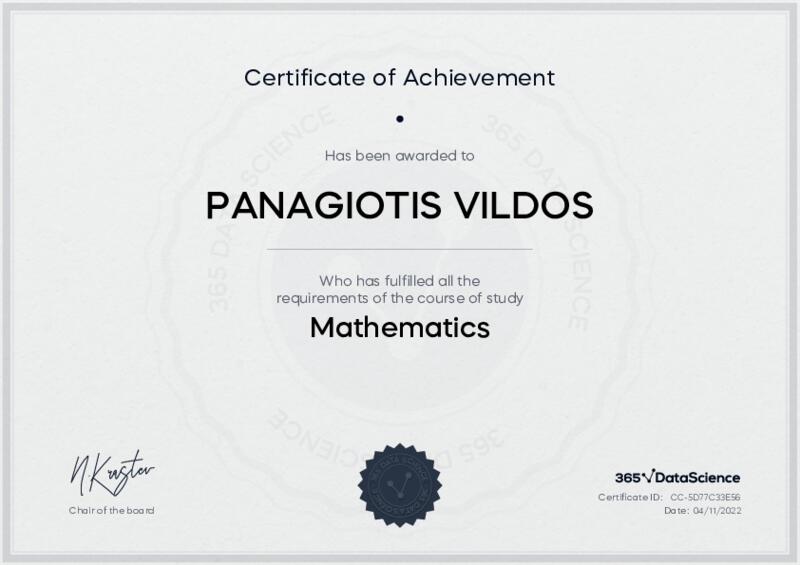 This user has been awarded the Mathematics Certificate for successfully completing the course exam. Holding this certificate demonstrates their proficiency on the topic and signifies they are qualified to apply their newly acquired expertise in the fields of data analytics and data science.