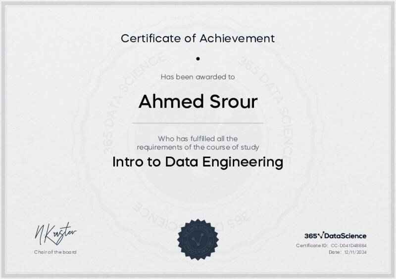 This user has been awarded the Intro to Data Engineering Certificate for successfully completing the course exam. Holding this certificate demonstrates their proficiency on the topic and signifies they are qualified to apply their newly acquired expertise in the fields of data analytics and data science.