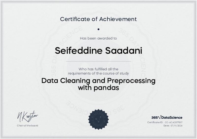 This user has been awarded the Data Cleaning and Preprocessing with pandas Certificate for successfully completing the course exam. Holding this certificate demonstrates their proficiency on the topic and signifies they are qualified to apply their newly acquired expertise in the fields of data analytics and data science.