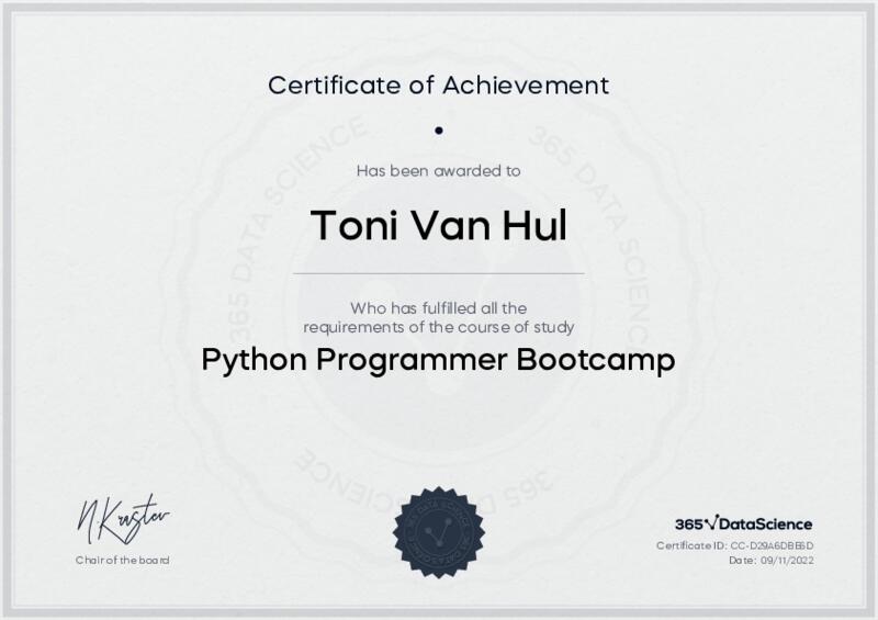 This user has been awarded the Python Programmer Bootcamp Certificate for successfully completing the course exam. Holding this certificate demonstrates their proficiency on the topic and signifies they are qualified to apply their newly acquired expertise in the fields of data analytics and data science.