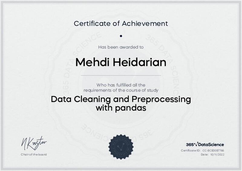 This user has been awarded the Data Cleaning and Preprocessing with pandas Certificate for successfully completing the course exam. Holding this certificate demonstrates their proficiency on the topic and signifies they are qualified to apply their newly acquired expertise in the fields of data analytics and data science.