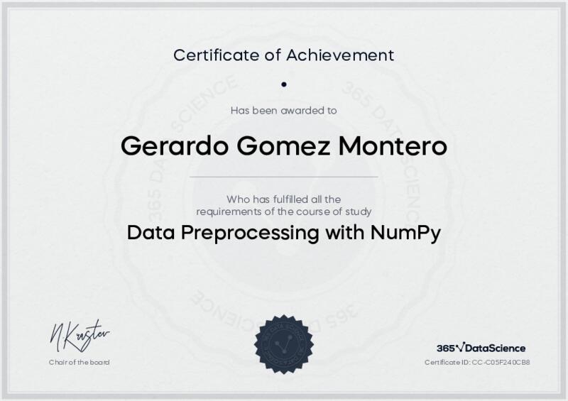 This user has been awarded the Data Preprocessing with NumPy Certificate for successfully completing the course exam. Holding this certificate demonstrates their proficiency on the topic and signifies they are qualified to apply their newly acquired expertise in the fields of data analytics and data science.