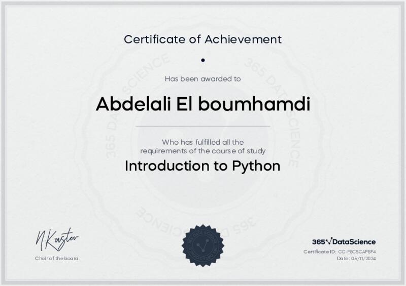 This user has been awarded the Introduction to Python Certificate for successfully completing the course exam. Holding this certificate demonstrates their proficiency on the topic and signifies they are qualified to apply their newly acquired expertise in the fields of data analytics and data science.