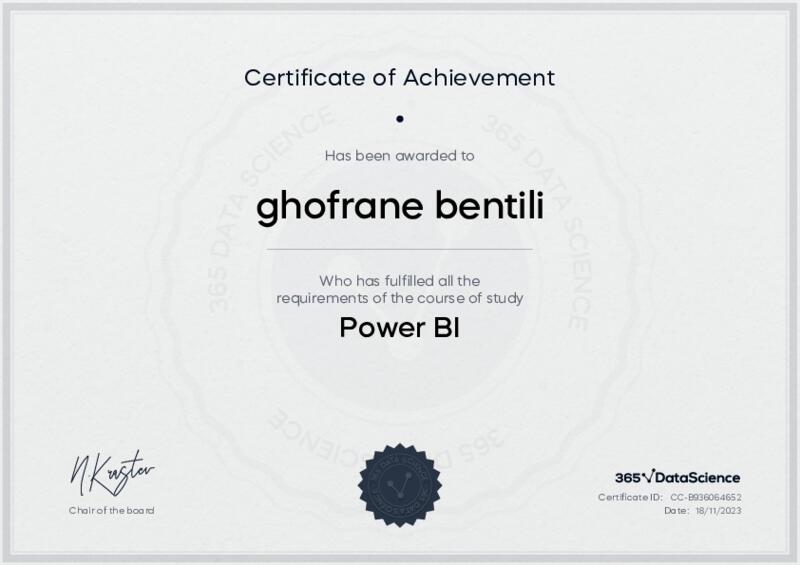 This user has been awarded the Power BI Certificate for successfully completing the course exam. Holding this certificate demonstrates their proficiency on the topic and signifies they are qualified to apply their newly acquired expertise in the fields of data analytics and data science.