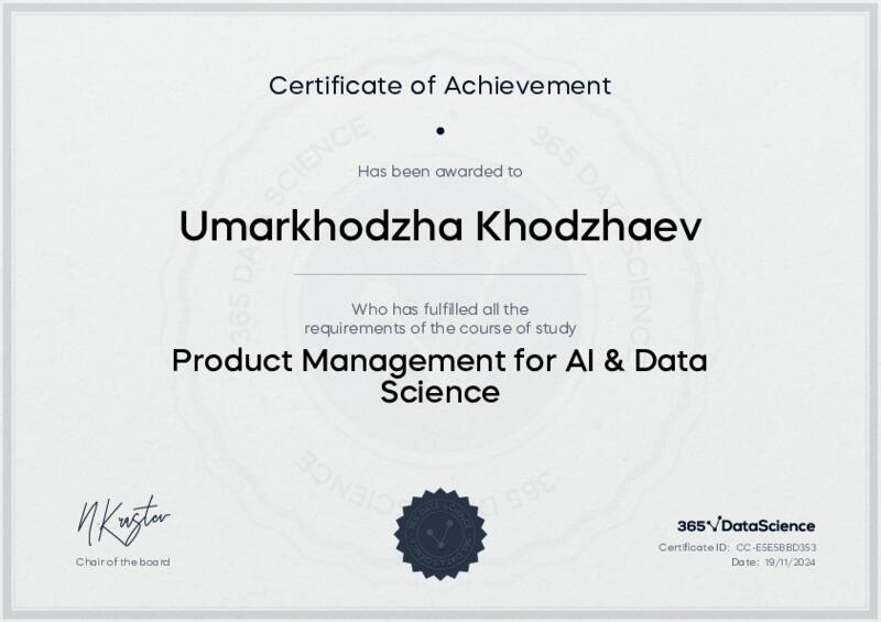 This user has been awarded the Product Management for AI & Data Science Certificate for successfully completing the course exam. Holding this certificate demonstrates their proficiency on the topic and signifies they are qualified to apply their newly acquired expertise in the fields of data analytics and data science.