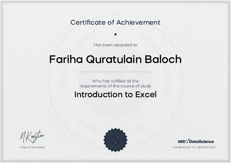 This user has been awarded the Introduction to Excel Certificate for successfully completing the course exam. Holding this certificate demonstrates their proficiency on the topic and signifies they are qualified to apply their newly acquired expertise in the fields of data analytics and data science.