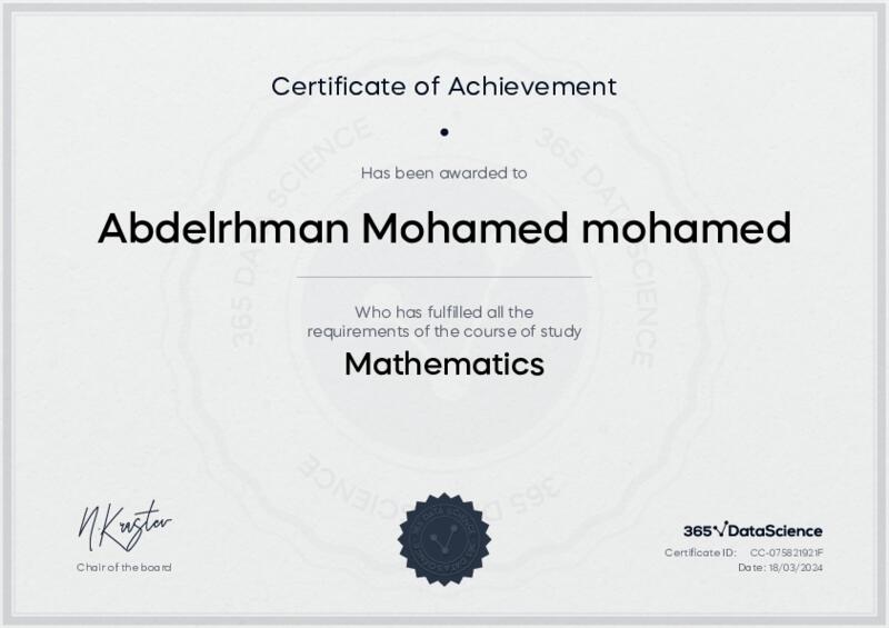 This user has been awarded the Mathematics Certificate for successfully completing the course exam. Holding this certificate demonstrates their proficiency on the topic and signifies they are qualified to apply their newly acquired expertise in the fields of data analytics and data science.