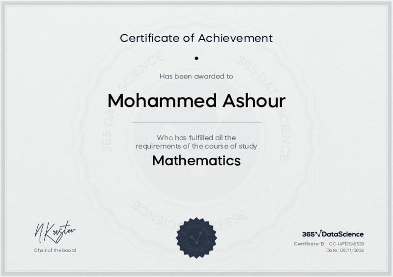 This user has been awarded the Mathematics Certificate for successfully completing the course exam. Holding this certificate demonstrates their proficiency on the topic and signifies they are qualified to apply their newly acquired expertise in the fields of data analytics and data science.