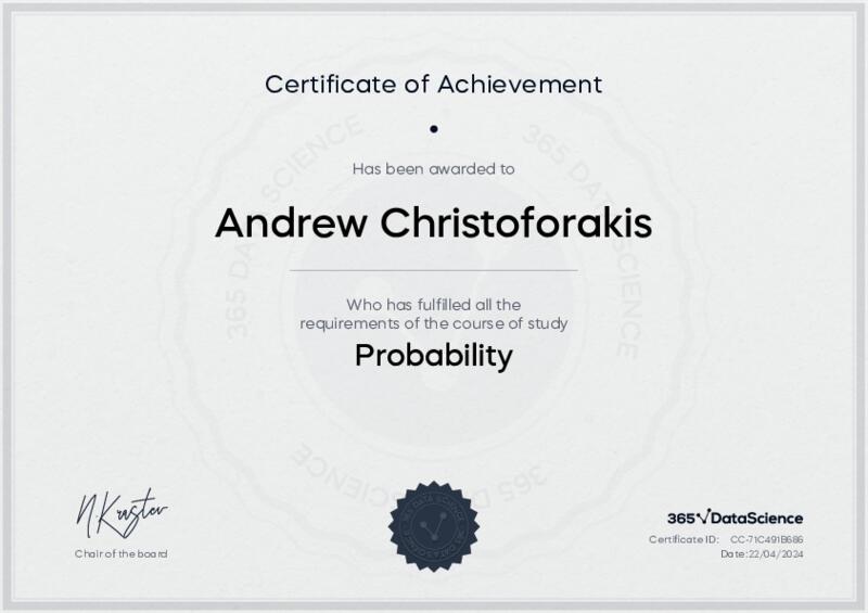 This user has been awarded the Probability Certificate for successfully completing the course exam. Holding this certificate demonstrates their proficiency on the topic and signifies they are qualified to apply their newly acquired expertise in the fields of data analytics and data science.