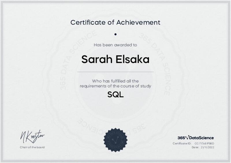 This user has been awarded the SQL Certificate for successfully completing the course exam. Holding this certificate demonstrates their proficiency on the topic and signifies they are qualified to apply their newly acquired expertise in the fields of data analytics and data science.