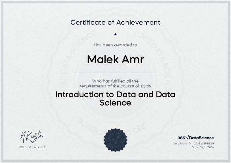 This user has been awarded the Introduction to Data and Data Science Certificate for successfully completing the course exam. Holding this certificate demonstrates their proficiency on the topic and signifies they are qualified to apply their newly acquired expertise in the fields of data analytics and data science.
