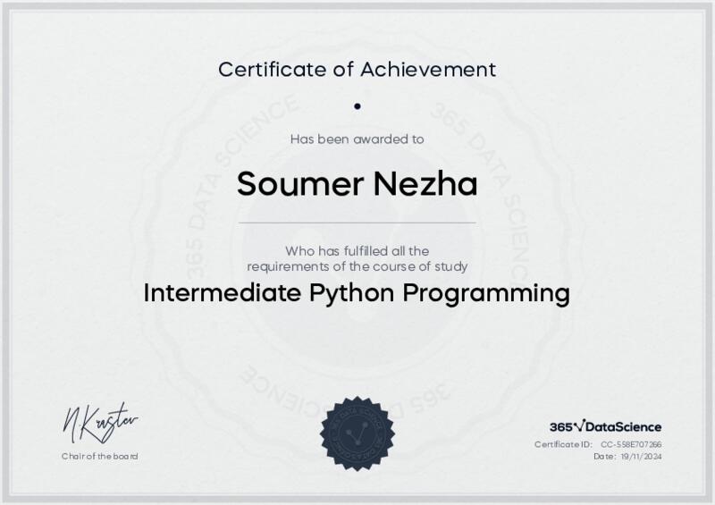 This user has been awarded the Intermediate Python Programming Certificate for successfully completing the course exam. Holding this certificate demonstrates their proficiency on the topic and signifies they are qualified to apply their newly acquired expertise in the fields of data analytics and data science.