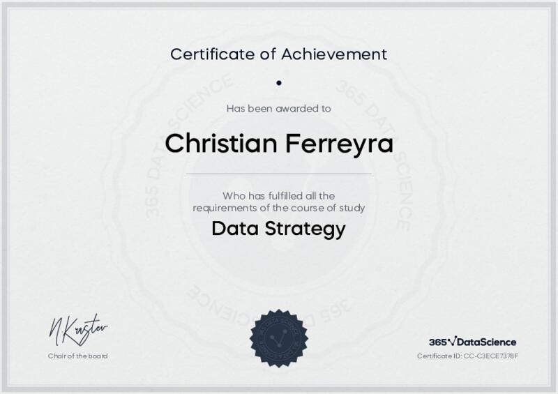 This user has been awarded the Data Strategy Certificate for successfully completing the course exam. Holding this certificate demonstrates their proficiency on the topic and signifies they are qualified to apply their newly acquired expertise in the fields of data analytics and data science.