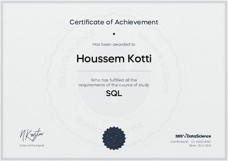 This user has been awarded the SQL Certificate for successfully completing the course exam. Holding this certificate demonstrates their proficiency on the topic and signifies they are qualified to apply their newly acquired expertise in the fields of data analytics and data science.