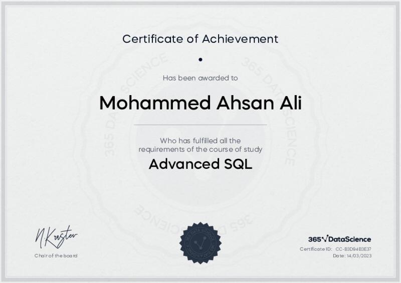 This user has been awarded the Advanced SQL Certificate for successfully completing the course exam. Holding this certificate demonstrates their proficiency on the topic and signifies they are qualified to apply their newly acquired expertise in the fields of data analytics and data science.