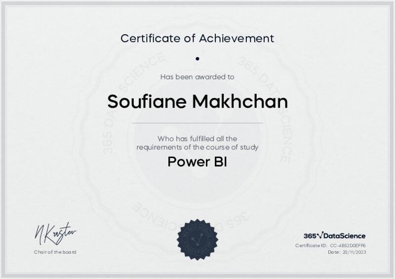 This user has been awarded the Power BI Certificate for successfully completing the course exam. Holding this certificate demonstrates their proficiency on the topic and signifies they are qualified to apply their newly acquired expertise in the fields of data analytics and data science.