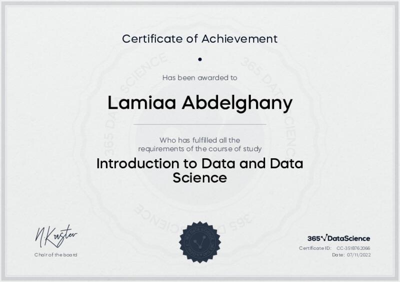 This user has been awarded the Introduction to Data and Data Science Certificate for successfully completing the course exam. Holding this certificate demonstrates their proficiency on the topic and signifies they are qualified to apply their newly acquired expertise in the fields of data analytics and data science.