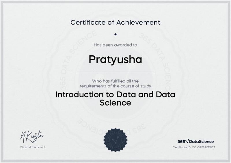 This user has been awarded the Introduction to Data and Data Science Certificate for successfully completing the course exam. Holding this certificate demonstrates their proficiency on the topic and signifies they are qualified to apply their newly acquired expertise in the fields of data analytics and data science.