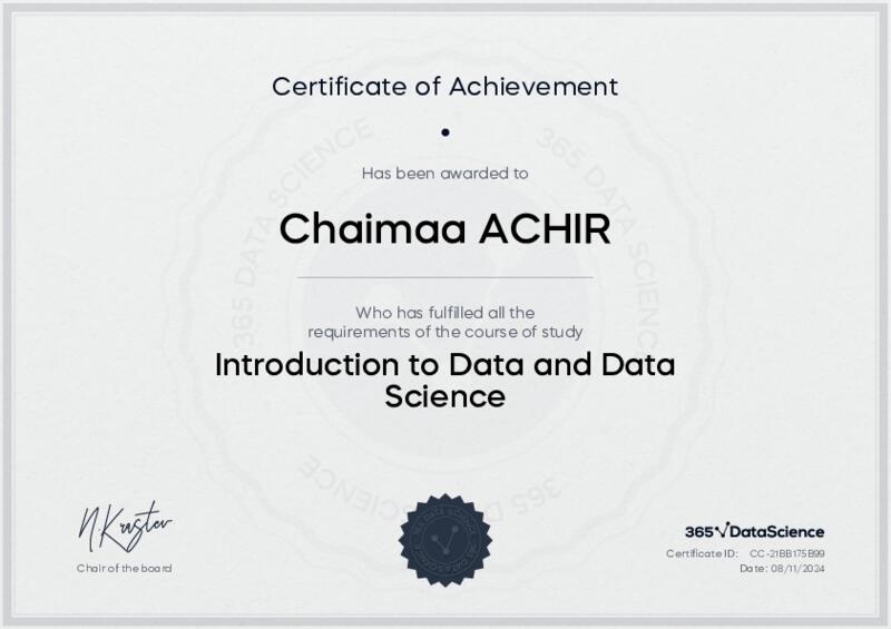 This user has been awarded the Introduction to Data and Data Science Certificate for successfully completing the course exam. Holding this certificate demonstrates their proficiency on the topic and signifies they are qualified to apply their newly acquired expertise in the fields of data analytics and data science.