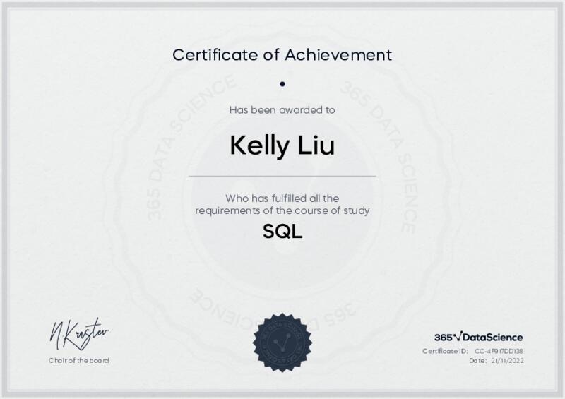 This user has been awarded the SQL Certificate for successfully completing the course exam. Holding this certificate demonstrates their proficiency on the topic and signifies they are qualified to apply their newly acquired expertise in the fields of data analytics and data science.