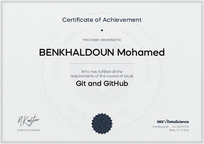 This user has been awarded the Git and GitHub Certificate for successfully completing the course exam. Holding this certificate demonstrates their proficiency on the topic and signifies they are qualified to apply their newly acquired expertise in the fields of data analytics and data science.