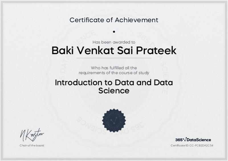 This user has been awarded the Introduction to Data and Data Science Certificate for successfully completing the course exam. Holding this certificate demonstrates their proficiency on the topic and signifies they are qualified to apply their newly acquired expertise in the fields of data analytics and data science.