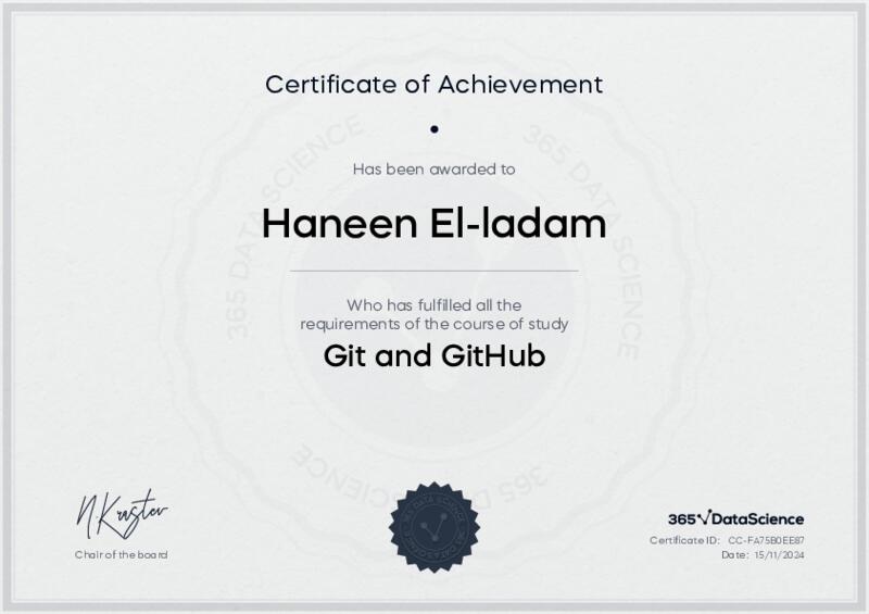 This user has been awarded the Git and GitHub Certificate for successfully completing the course exam. Holding this certificate demonstrates their proficiency on the topic and signifies they are qualified to apply their newly acquired expertise in the fields of data analytics and data science.