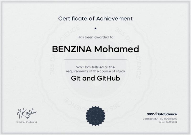 This user has been awarded the Git and GitHub Certificate for successfully completing the course exam. Holding this certificate demonstrates their proficiency on the topic and signifies they are qualified to apply their newly acquired expertise in the fields of data analytics and data science.
