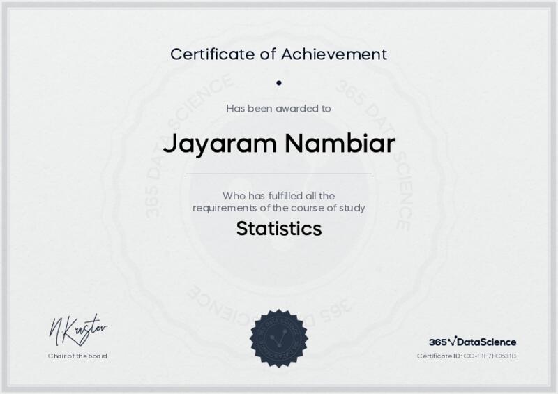 This user has been awarded the Statistics Certificate for successfully completing the course exam. Holding this certificate demonstrates their proficiency on the topic and signifies they are qualified to apply their newly acquired expertise in the fields of data analytics and data science.