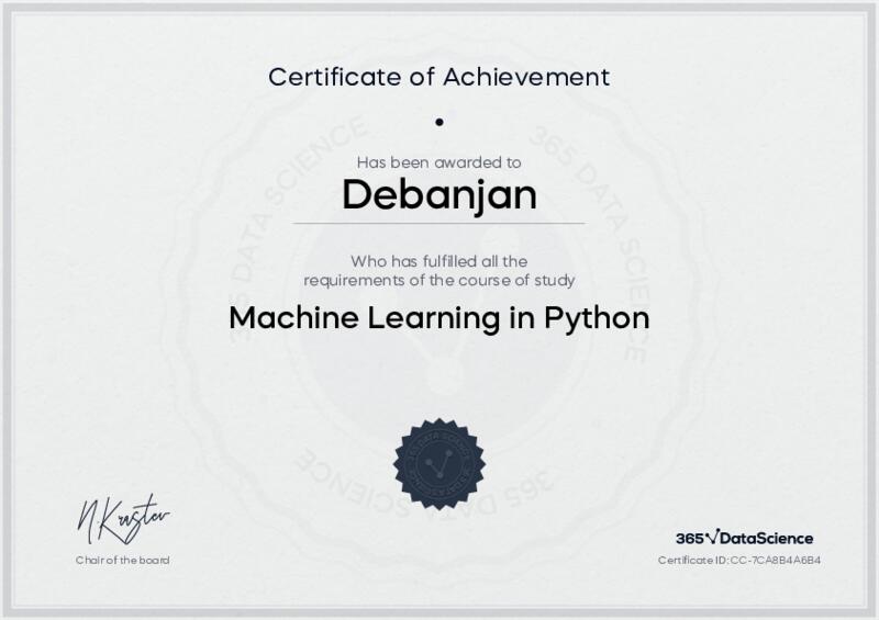 This user has been awarded the Machine Learning in Python Certificate for successfully completing the course exam. Holding this certificate demonstrates their proficiency on the topic and signifies they are qualified to apply their newly acquired expertise in the fields of data analytics and data science.