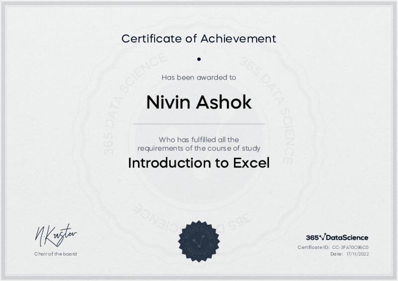 This user has been awarded the Introduction to Excel Certificate for successfully completing the course exam. Holding this certificate demonstrates their proficiency on the topic and signifies they are qualified to apply their newly acquired expertise in the fields of data analytics and data science.