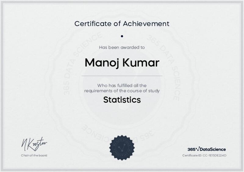 This user has been awarded the Statistics Certificate for successfully completing the course exam. Holding this certificate demonstrates their proficiency on the topic and signifies they are qualified to apply their newly acquired expertise in the fields of data analytics and data science.