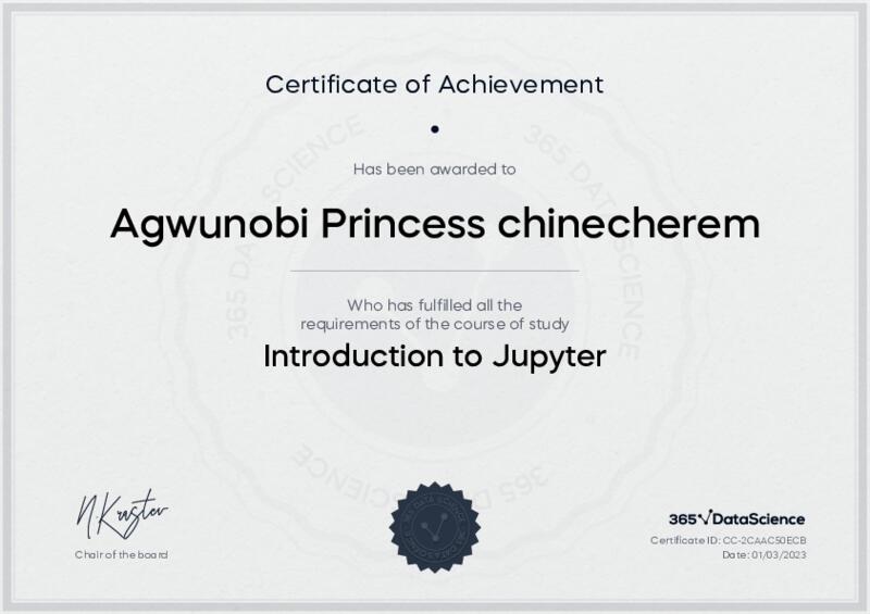 This user has been awarded the Introduction to Jupyter Certificate for successfully completing the course exam. Holding this certificate demonstrates their proficiency on the topic and signifies they are qualified to apply their newly acquired expertise in the fields of data analytics and data science.