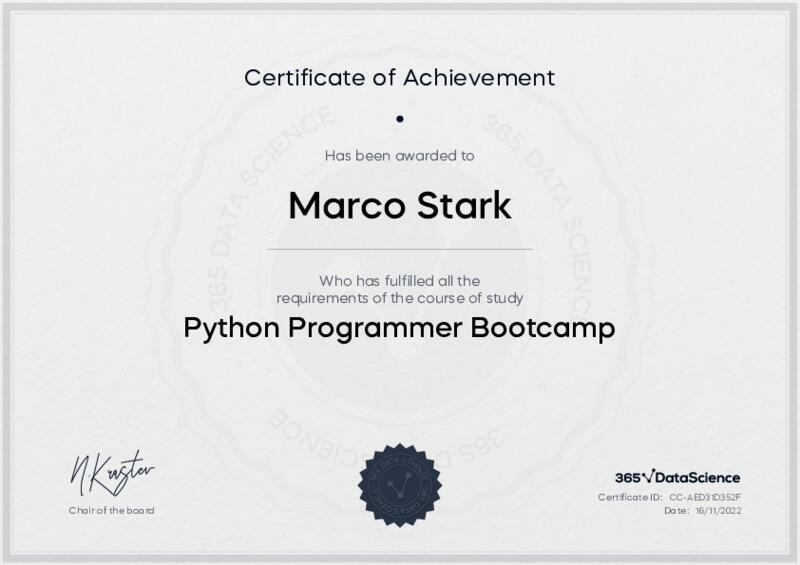 This user has been awarded the Python Programmer Bootcamp Certificate for successfully completing the course exam. Holding this certificate demonstrates their proficiency on the topic and signifies they are qualified to apply their newly acquired expertise in the fields of data analytics and data science.